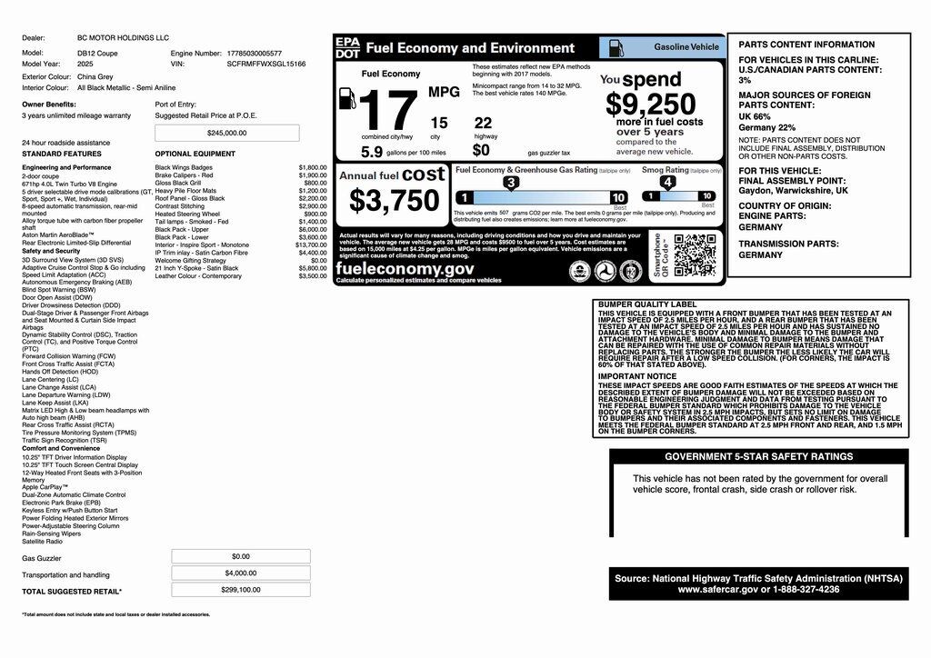 Gloss Black Grill, 16 Way Electric Front Seats w/Memory, Active Cruise Control, Aston Martin Black Wings & Script Exterior Badging, Contrast Stitching, Gloss Black Lower Body Exterior Package, Gloss Black Roof, Gloss Black Upper Body Exterior Package, Heated Sports Steering Wheel, Inspire Sport Environment - Monotone, Red Painted Brake Calipers, Satin 2x2 Twill Carbon Fiber IP/Door Trim Inlay, Seat Ventilation, Semi-Aniline Leather & Alcantara Seat Trim, Smoked Tail Lights, Wheels: 21" Y-Spoke Satin Black.