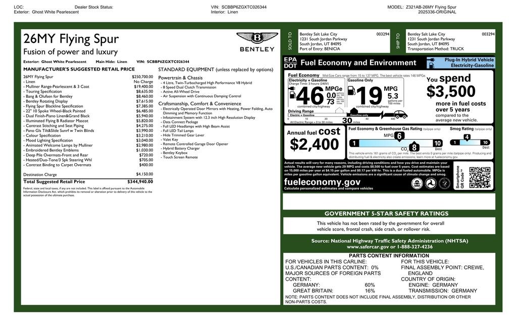 This Flying Spur features a twin-turbocharged High Performance V8 plug-in hybrid powertrain paired with an 8-speed dual clutch transmission and active all-wheel drive. Touring Specification, Mulliner content, and Bang & Olufsen for Bentley deliver advanced technology, elevated craftsmanship, and precise performance. Air suspension with continuous damping control provides a balanced driving experience, while premium interior materials and digital integration enhance comfort and usability.